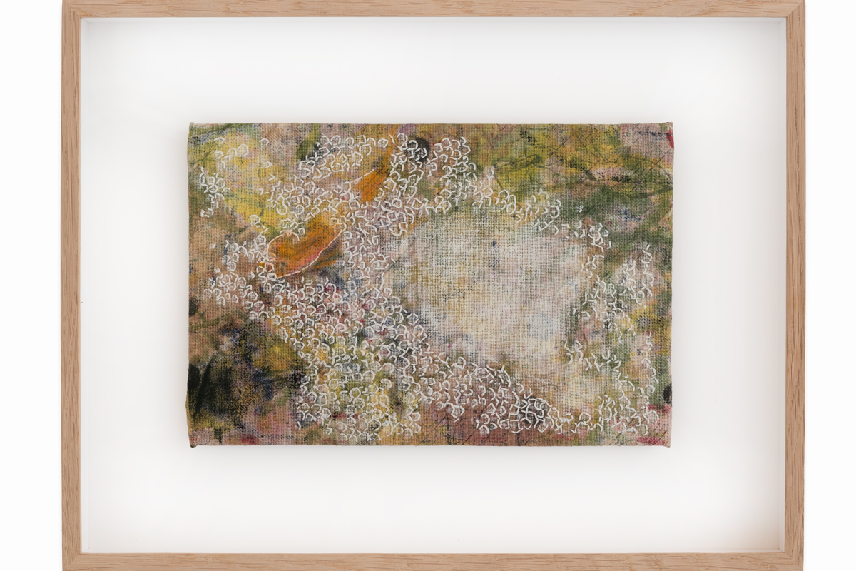 Textile, re-used canvas, pastel drawing, embroidery (framed)